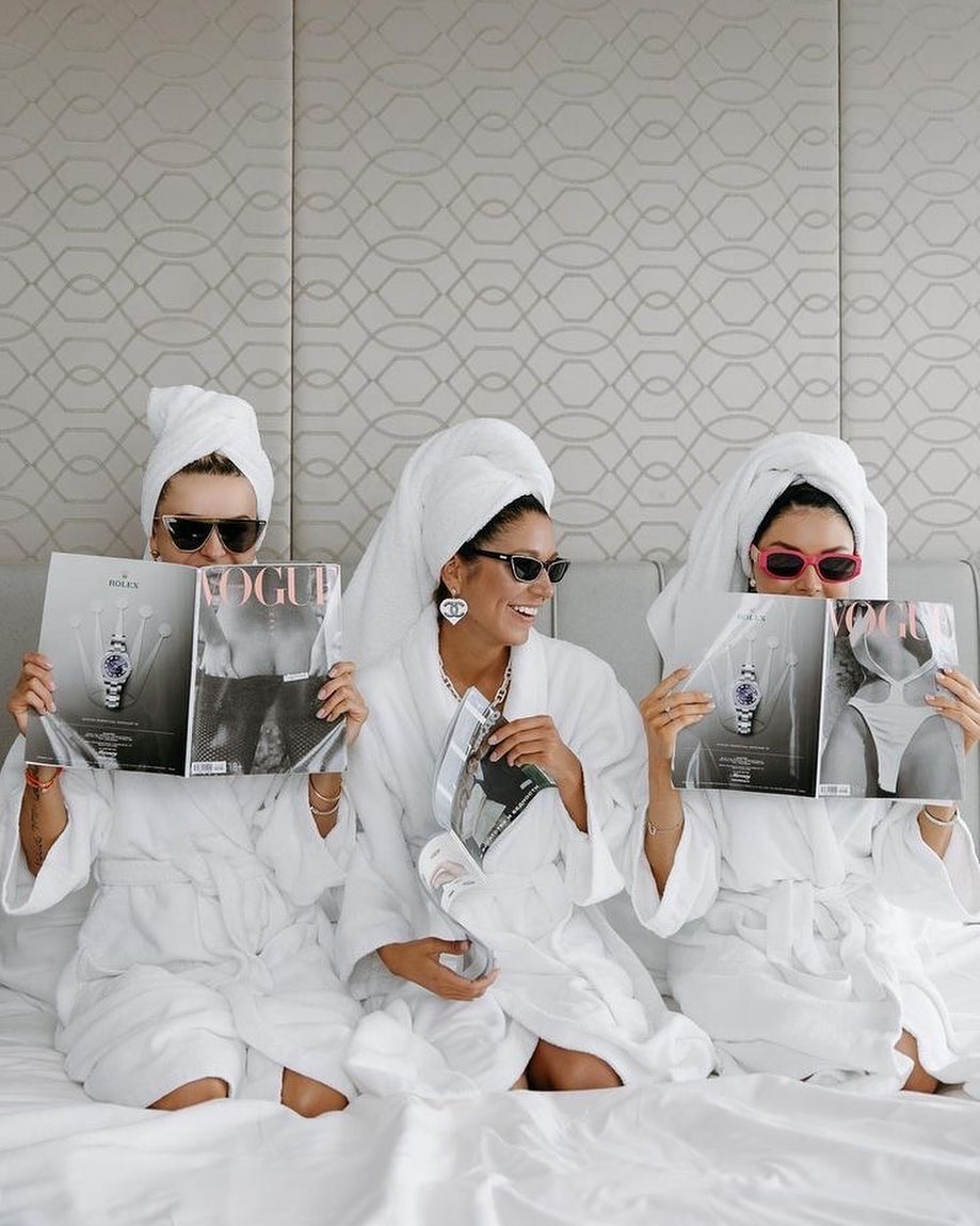 A cozy yet glamorous night filled with satin pajamas, face masks, and sparkling drinks.