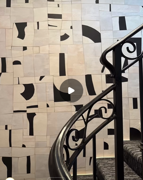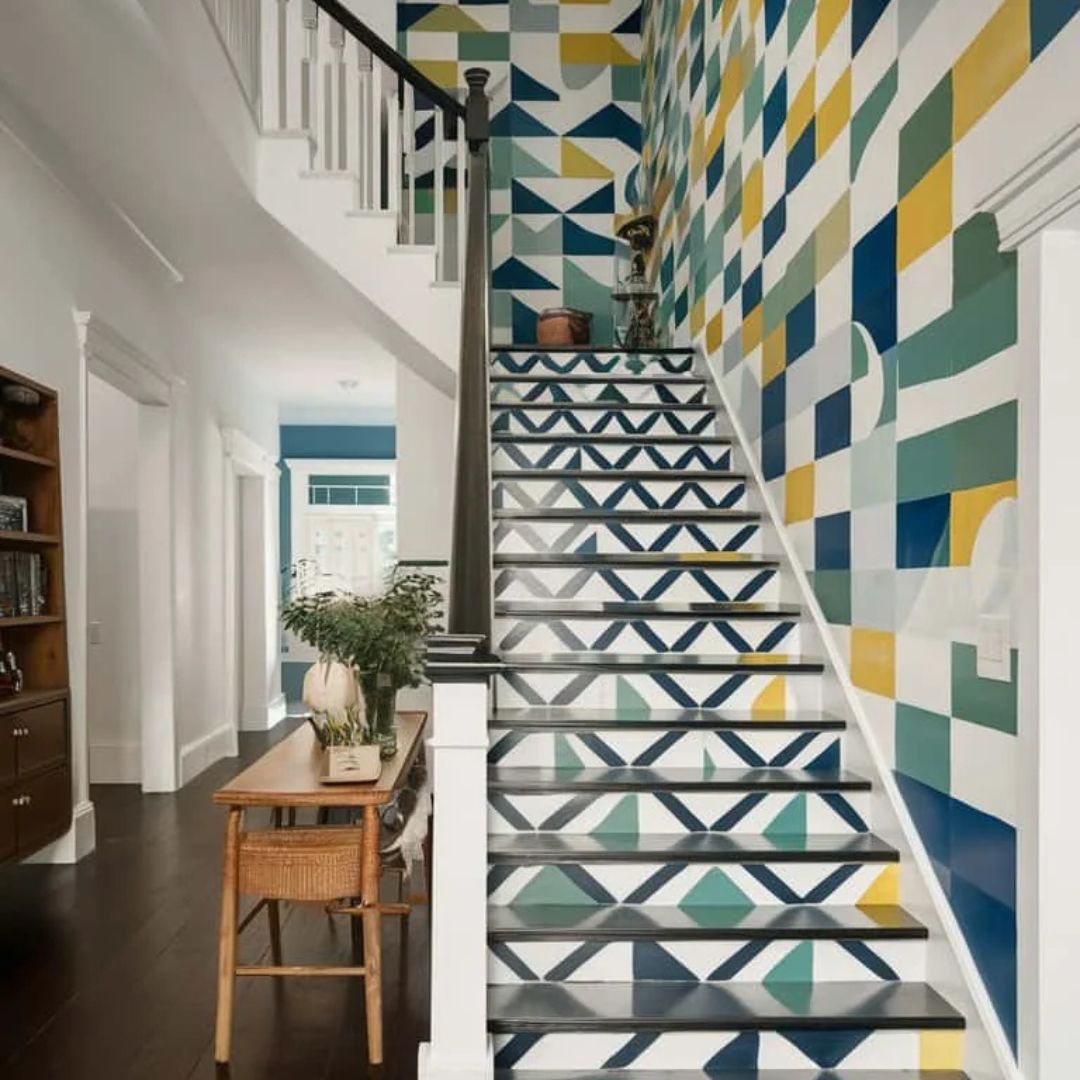 Geometric wallpaper brings a contemporary edge to staircase décor. Repeating shapes, clean lines, and contrasting colors create movement that complements the vertical rise of stairs. Patterns such as hexagons, chevrons, or abstract lines guide the eye upward and make narrow staircases feel dynamic. Neutral tones like black, gray, and white offer a sleek look, while gold or metallic accents add luxury. This wallpaper style pairs well with glass railings or minimalist staircases, making it ideal for modern apartments and urban homes.