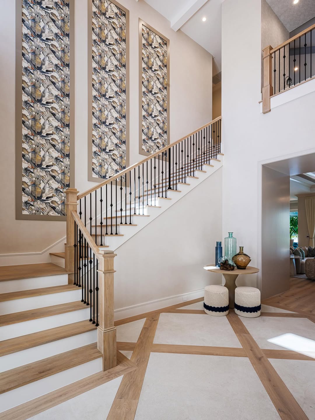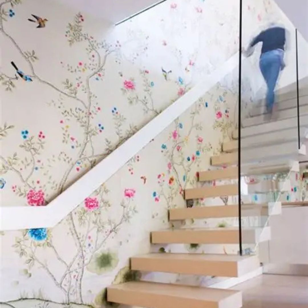 Floral wallpaper along a staircase adds timeless charm and soft sophistication to transitional spaces. Large-scale florals work beautifully in tall stairwells, creating visual flow from bottom to top. Choose muted tones like beige, dusty rose, or sage green for a refined look, or bold blooms for a dramatic statement. Pair floral wallpaper with white or wooden stair rails to balance the design. This style suits traditional, vintage, or cottage-inspired homes and makes the staircase feel warm and inviting while turning an often-overlooked area into a decorative focal point.