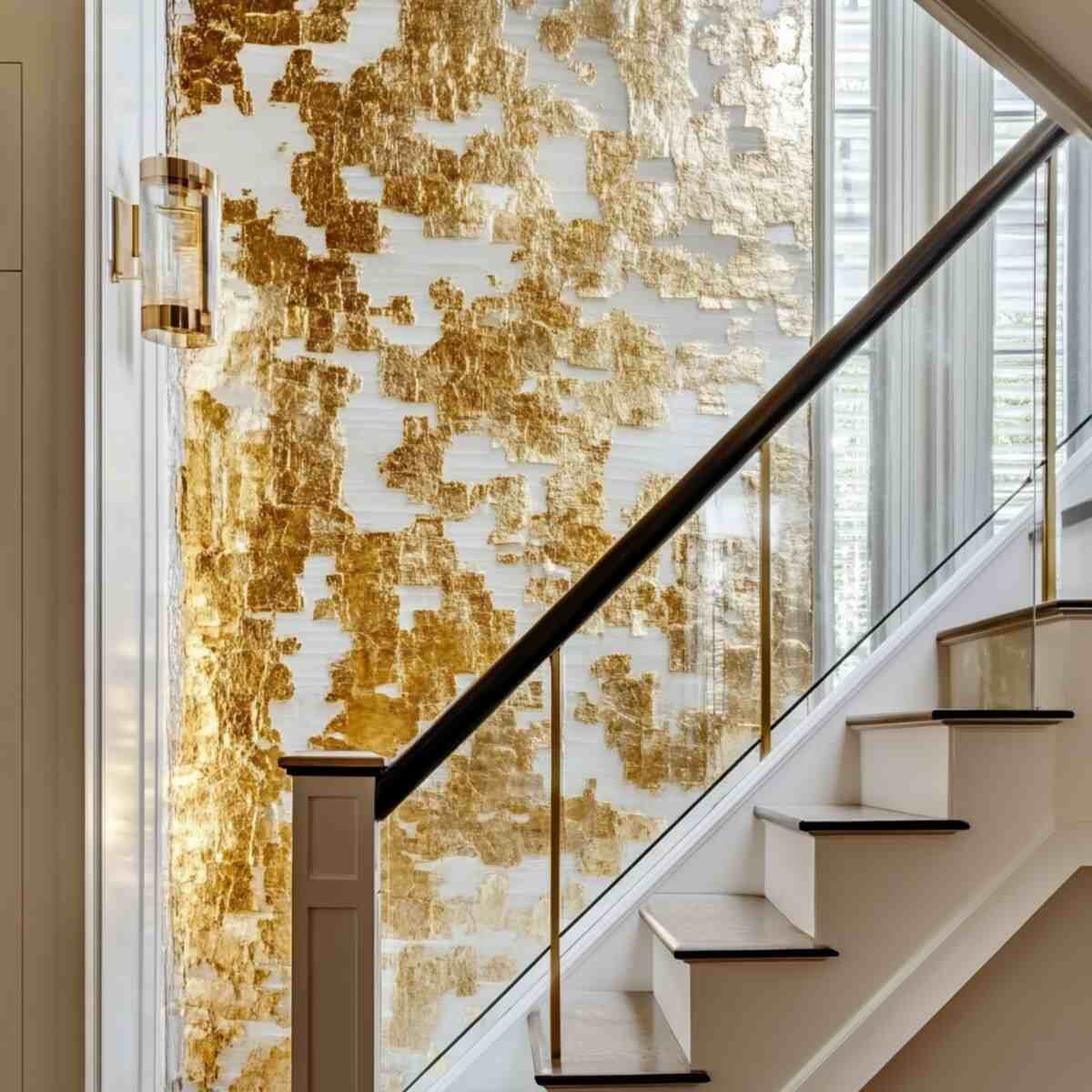 Metallic wallpaper adds glamour and light-reflecting beauty to staircase walls. Designs featuring gold, silver, or bronze accents catch natural and artificial light, enhancing the vertical space. Subtle metallic patterns work well in elegant homes, while bold metallic textures create a luxurious statement. Pair this wallpaper with sleek railings and warm lighting to amplify its effect. Metallic wallpaper elevates staircases by making them feel more expansive and refined, perfect for modern, art-deco, or luxury interior styles.