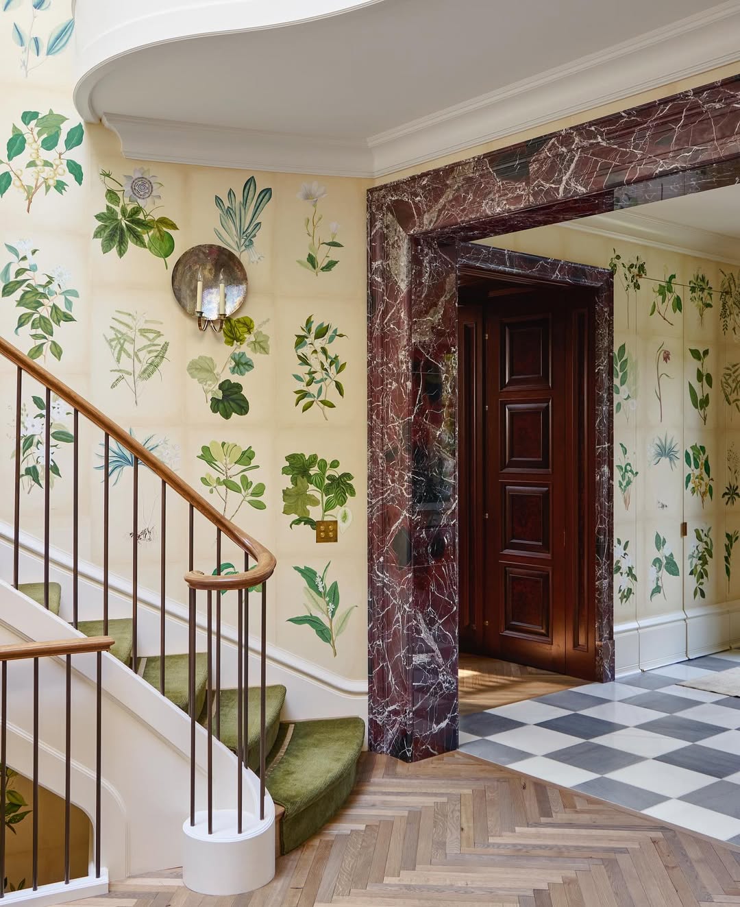Botanical wallpaper transforms a staircase into a calming, nature-filled passage. Leafy prints, vines, or tropical motifs bring freshness and depth to the walls, especially in homes with limited natural light. Green hues promote relaxation and create a seamless connection between indoor and outdoor spaces. Use botanical wallpaper to soften sharp architectural lines and complement wooden stairs or indoor plants placed on landings. This idea works well in eco-friendly, bohemian, or Scandinavian interiors, offering a peaceful and visually refreshing staircase experience.