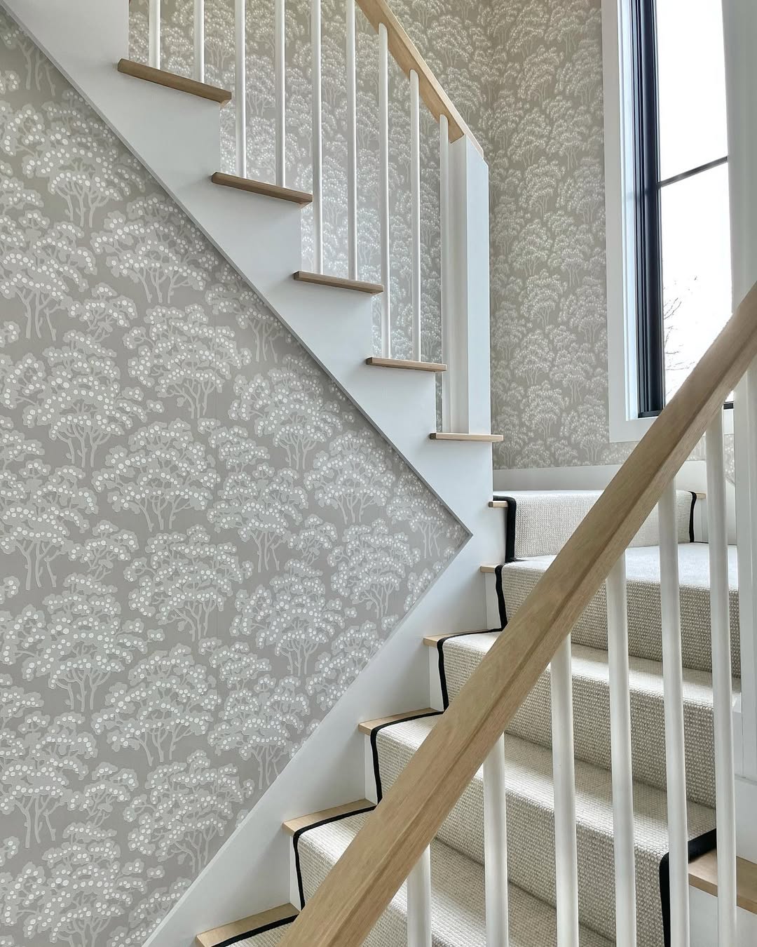 Wallpaper that complements framed artwork creates a gallery-style staircase. Choose subtle patterns that serve as a backdrop for photos, illustrations, or paintings arranged along the staircase wall. This layered approach adds depth and personal character while keeping visual harmony. Neutral or lightly patterned wallpaper ensures the artwork remains the focus. This idea transforms staircases into storytelling spaces, showcasing memories or artistic taste. It’s ideal for family homes and creative interiors looking to combine décor and functionality beautifully.