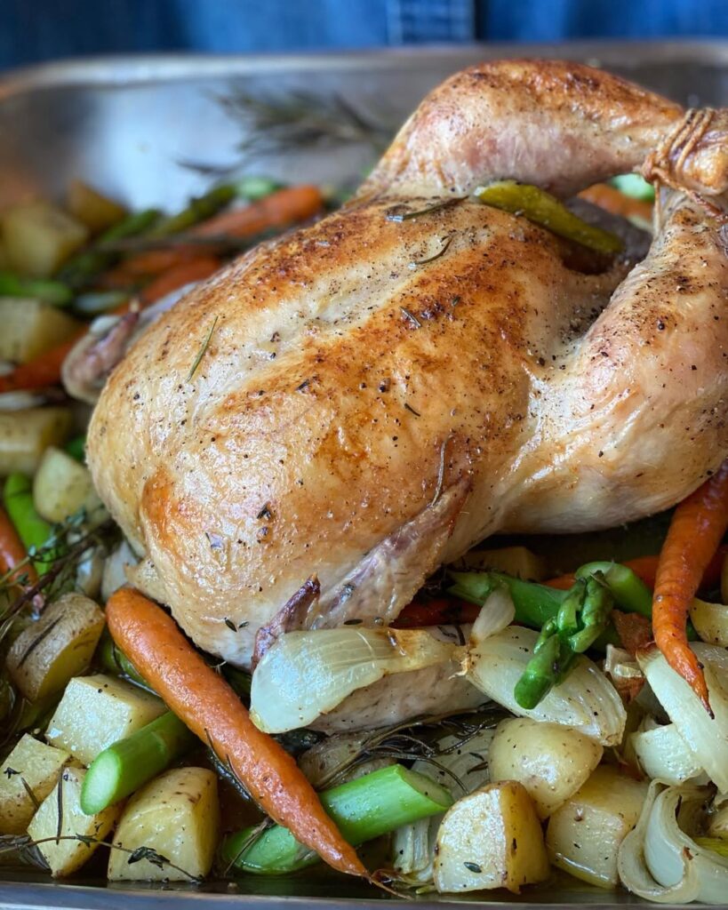 A golden, herb-roasted whole chicken with tender roasted vegetables is a traditional American Sunday dinner. It fills the home with comforting aromas and brings everyone to the table.