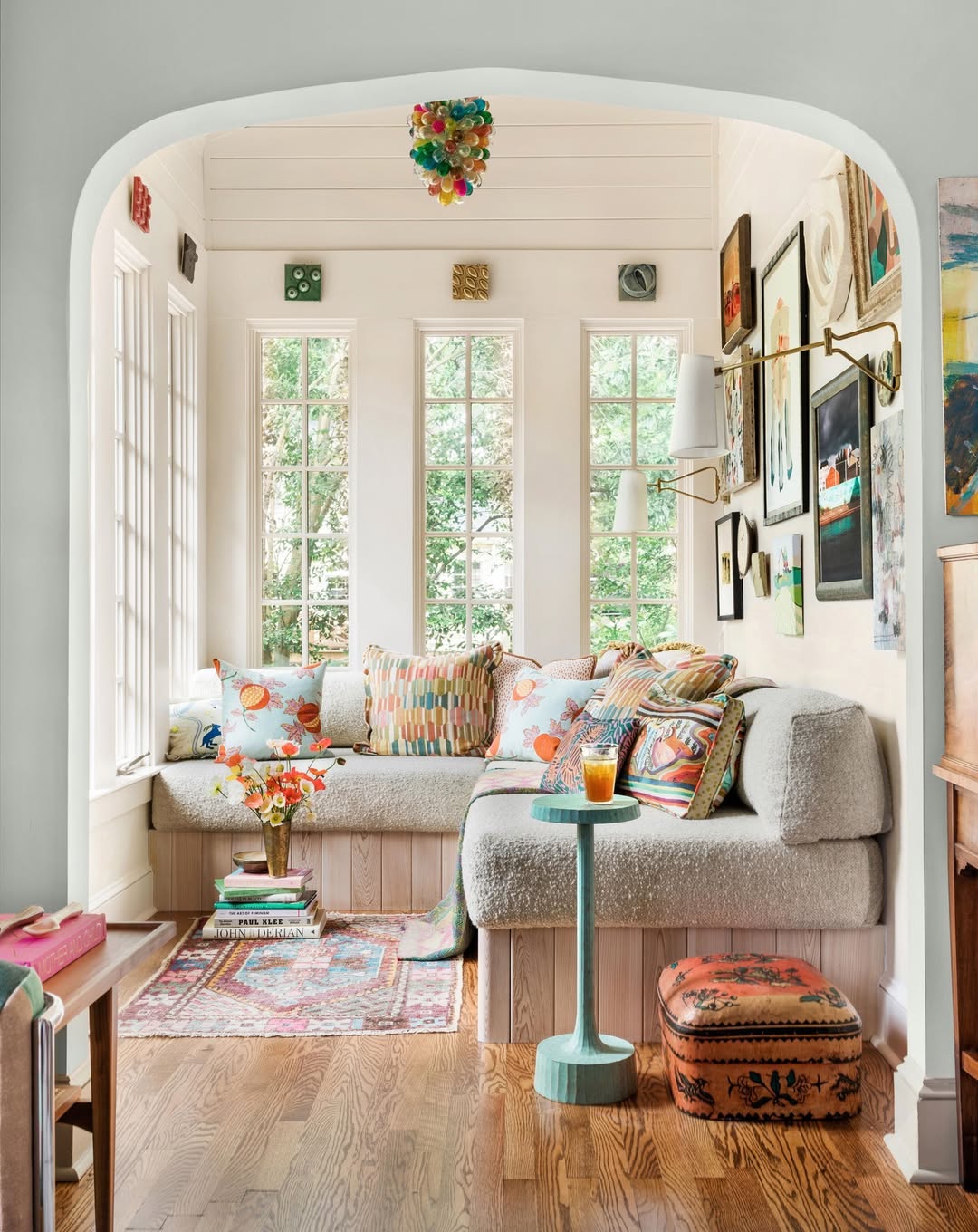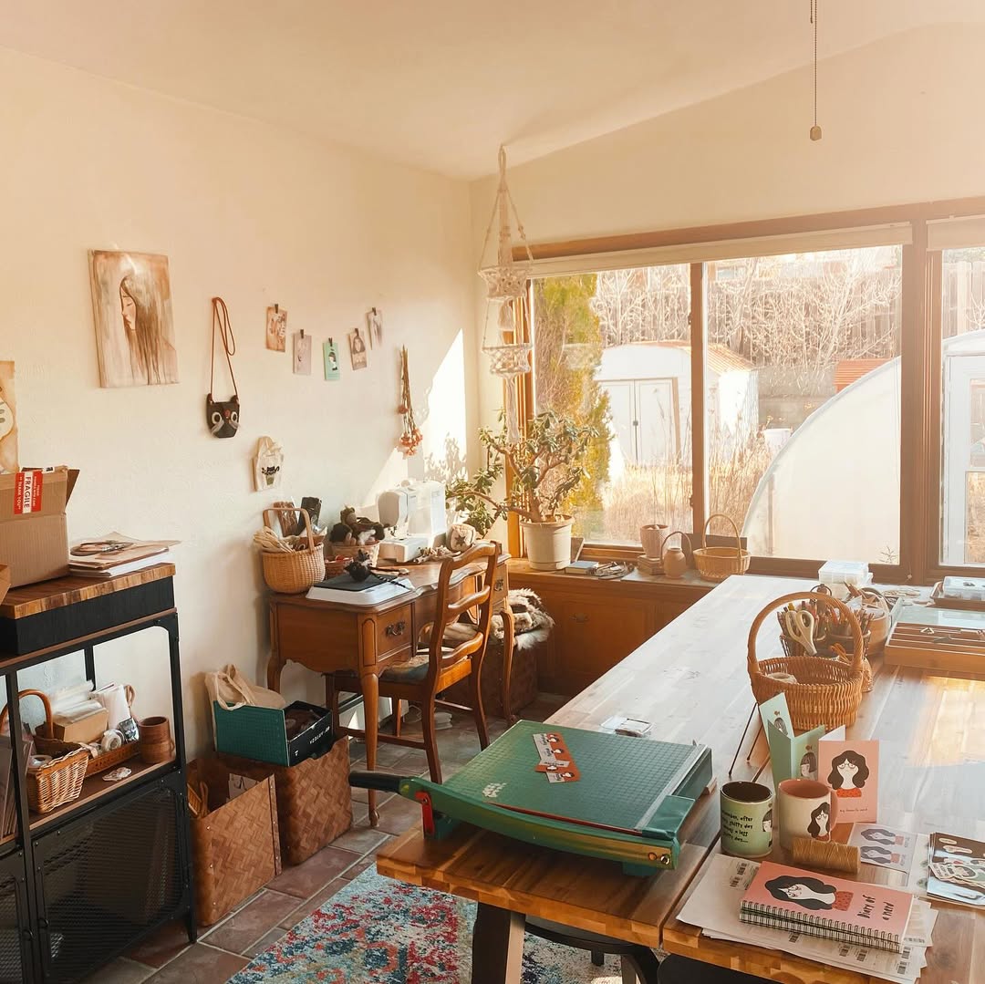 Make your sunroom a creative hub by turning it into an art or craft studio. The abundance of natural light makes it perfect for painting, sketching, or photography. Install a large easel, work desk, or crafting station. Open shelving can display supplies while also keeping them organized. Comfortable seating allows for inspiration breaks, while inspirational décor like framed art prints or colorful rugs boosts creativity. Plants add freshness and reduce stress, making the space more enjoyable. This sunroom idea is perfect for artists or hobbyists who thrive in a bright, inspiring environment.