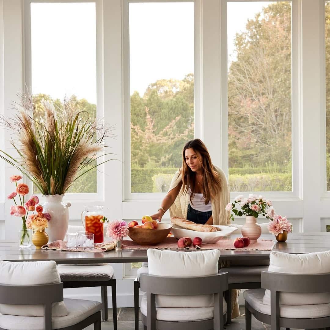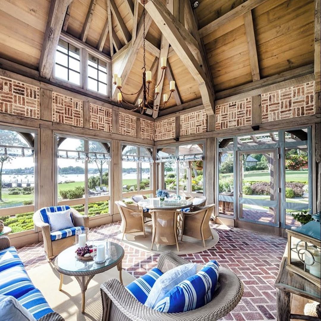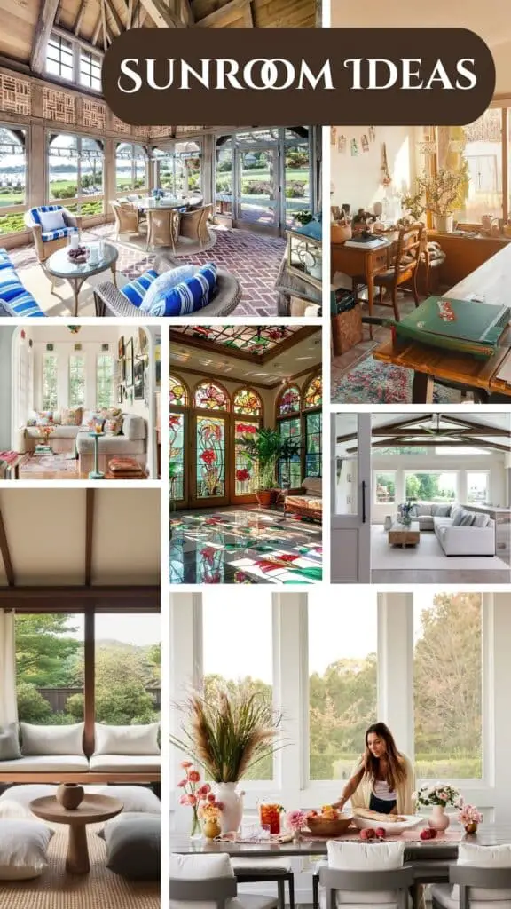 Create warmth with exposed wooden beams, shiplap walls, and distressed wooden furniture. Add a cozy loveseat draped with plaid or knitted throws, along with vintage décor like lanterns, baskets, and mason jars. Incorporate natural textures such as stone or brick flooring for an authentic farmhouse feel. Wicker chairs and a large wooden dining table can make it functional for family meals or gatherings. Potted herbs or seasonal flowers add freshness and charm. This sunroom is perfect for those who love a countryside aesthetic, blending comfort and character in a welcoming, lived-in atmosphere.