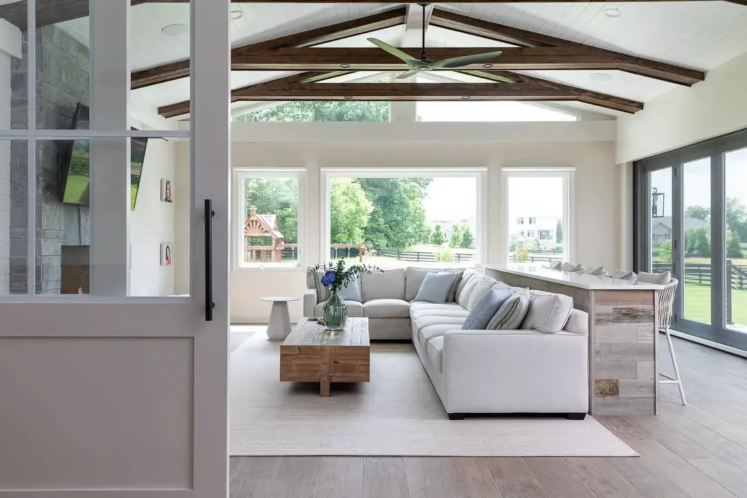 Design your sunroom as a versatile family-friendly space. Include a large sectional sofa for lounging, a sturdy coffee table for board games, and storage ottomans for toys or blankets. A mix of seating options ensures everyone has a spot to relax. Durable rugs and washable fabrics make it practical for kids and pets. Add a TV or projector for movie nights and sliding doors for easy indoor-outdoor flow. Plants and cheerful décor brighten the space. This sunroom is ideal for families who want a cozy, flexible room that works for relaxation, play, and entertainment.
