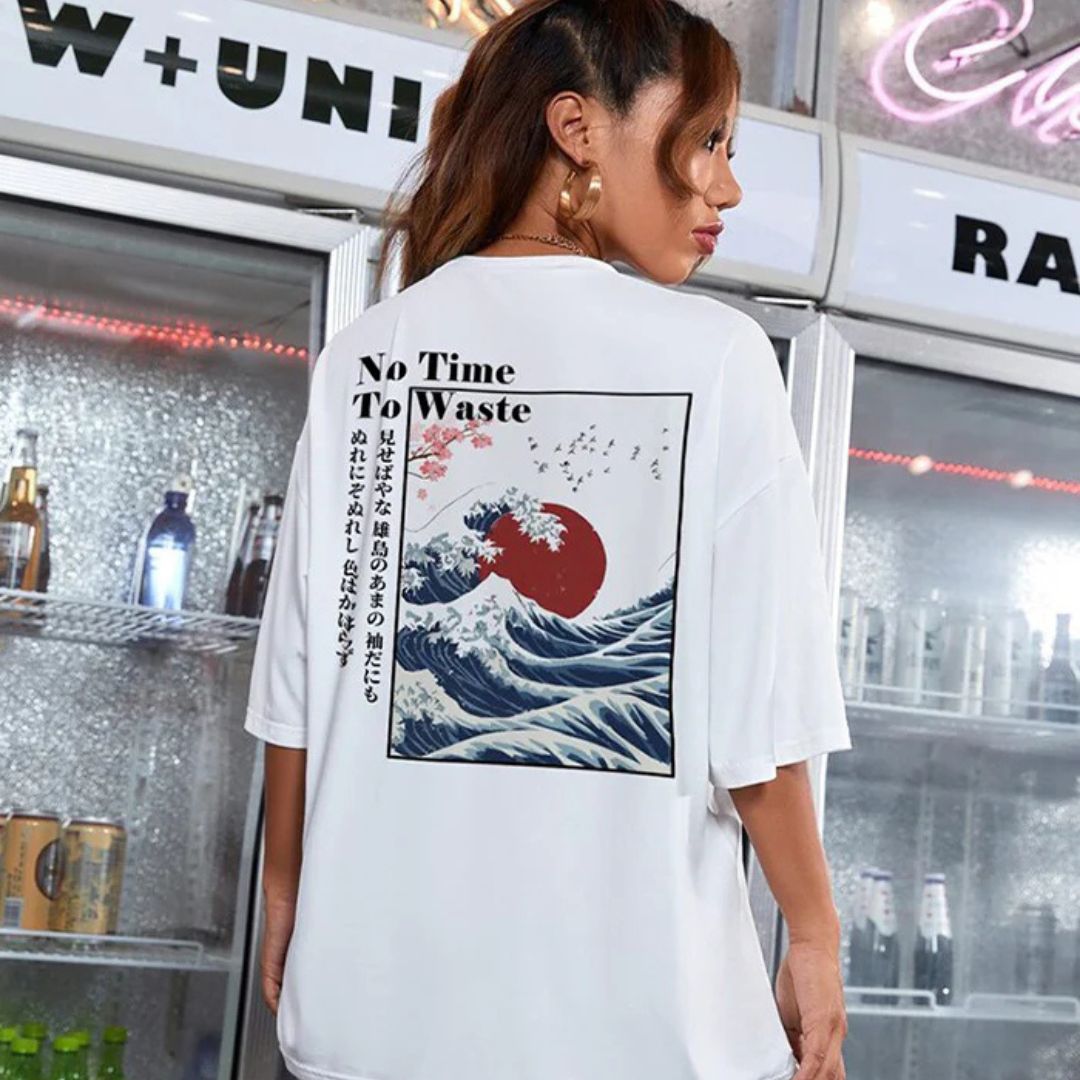 Inspired by Japanese ukiyo-e art, this design features a bold, dramatic ocean wave with crisp outlines and stylized foam. Adding kanji characters, a rising sun, or subtle geometric patterns can enhance the streetwear feel. Colors like deep blue, red, and white create contrast and cultural richness. This concept blends tradition with modern fashion trends, making it perfect for fans of Japanese art, anime culture, and striking, high-impact graphics. Works well on both black and white T-shirts, giving a strong visual identity.