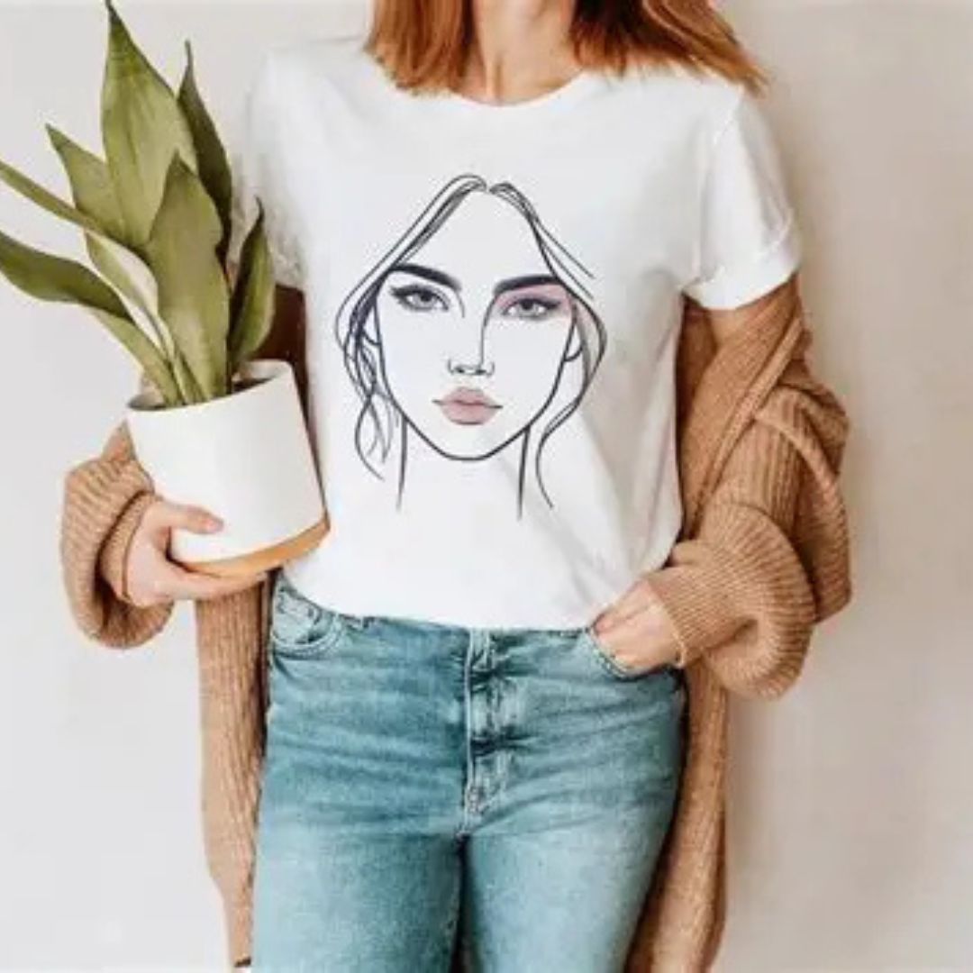 This T-shirt features abstract single-line drawings of human faces, offering a modern, artsy aesthetic. The simplicity of the lines creates a calm, refined look suitable for streetwear or casual settings. Printed in black on white, beige, or muted earth-toned shirts, the minimalist style feels elegant yet expressive. Adding a pop of color—like a small geometric shape behind the illustration—can elevate the design. This concept appeals to fans of contemporary art, clean aesthetics, and subtle fashion statements. It’s perfect for unisex wear and pairs beautifully with neutral minimal wardrobes.