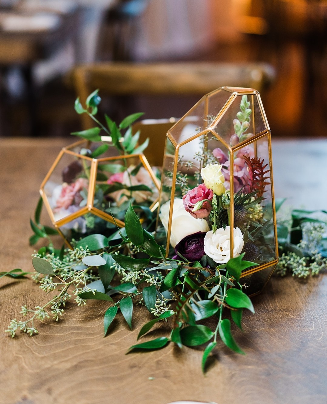 A collection of mini terrariums provides a modern, whimsical centerpiece that feels like tiny worlds placed along your table. Use glass cloches, geometric terrariums, or open glass bowls filled with succulents, sand, pebbles, and miniature figurines. This design brings a touch of nature indoors while offering a clean, contemporary aesthetic. Terrariums require minimal maintenance and can be customized to match themes, from desert landscapes to woodland scenes. Arrange them in varying heights for dimension, and place them along a runner or mirrored tray for added depth and shine.
