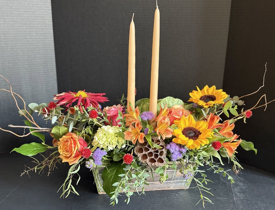 A rustic wooden crate makes a warm and inviting centerpiece ideal for farmhouse, country, or outdoor events. Fill the crate with a mix of seasonal flowers, eucalyptus, and dried foliage to create a lush, overflowing look. Add small LED candles or fairy lights inside for a soft, glowing effect that enhances evening ambiance. You can also incorporate mini chalkboard labels, pinecones, or vintage glass bottles for added personality. This style works beautifully for long tables, creating visual cohesion while offering enough height and texture to stand out without obstructing conversation across the table.