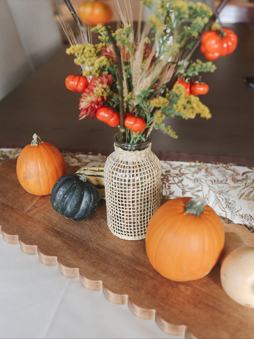 A pumpkin-based centerpiece is perfect for fall celebrations, Thanksgiving dinners, or rustic gatherings. Use a combination of large pumpkins, mini gourds, and decorative squash arranged in a wooden tray or directly on a fabric runner. Enhance the display with dried leaves, cinnamon sticks, and warm-toned flowers like marigolds or sunflowers. For a more polished look, consider painting pumpkins in metallic tones such as gold or copper. Add fairy lights or tea candles for a cozy glow. The result is a warm, seasonal display that instantly sets the tone for a festive feast.
