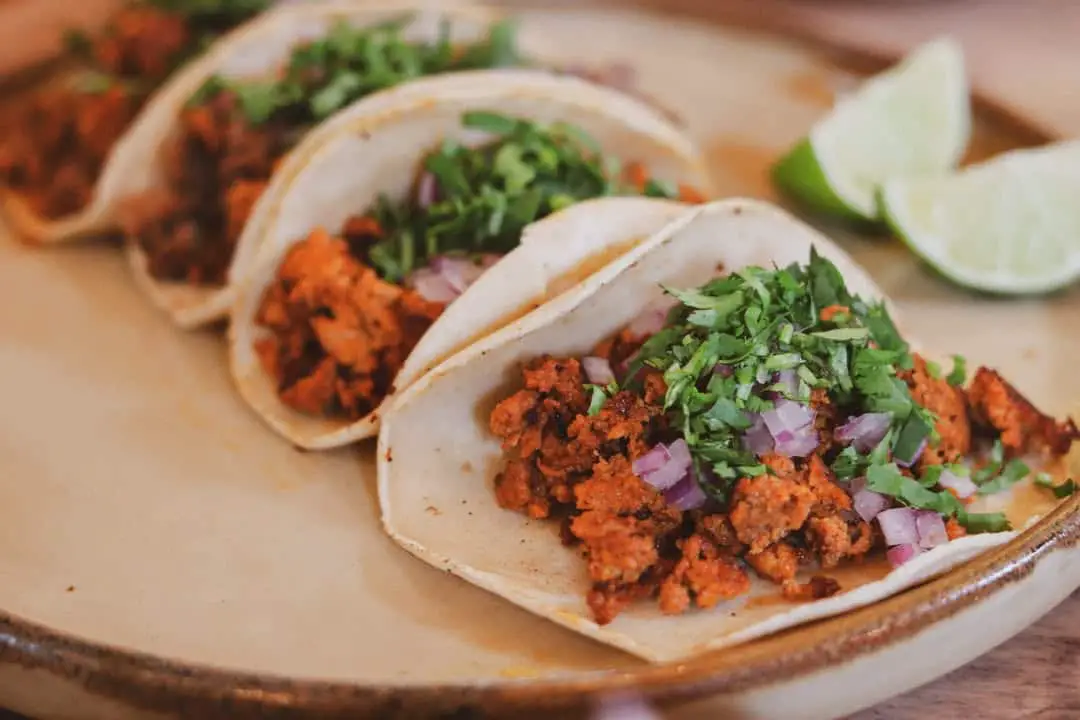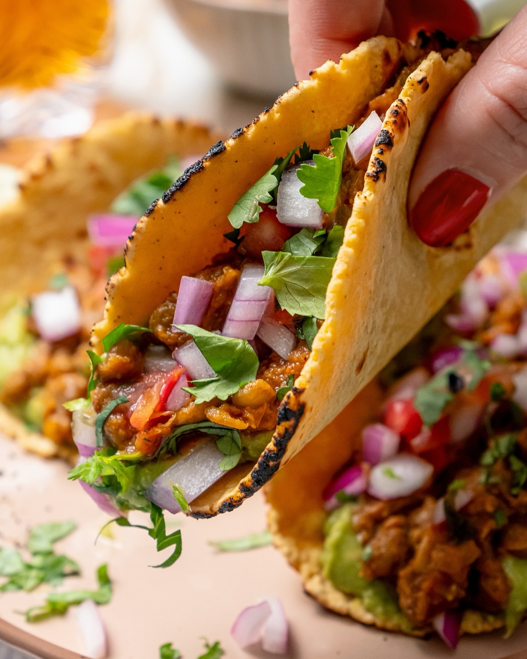 • Description: A hearty plant-based option — lentils cooked with spices and vegetables mimic taco meat beautifully.