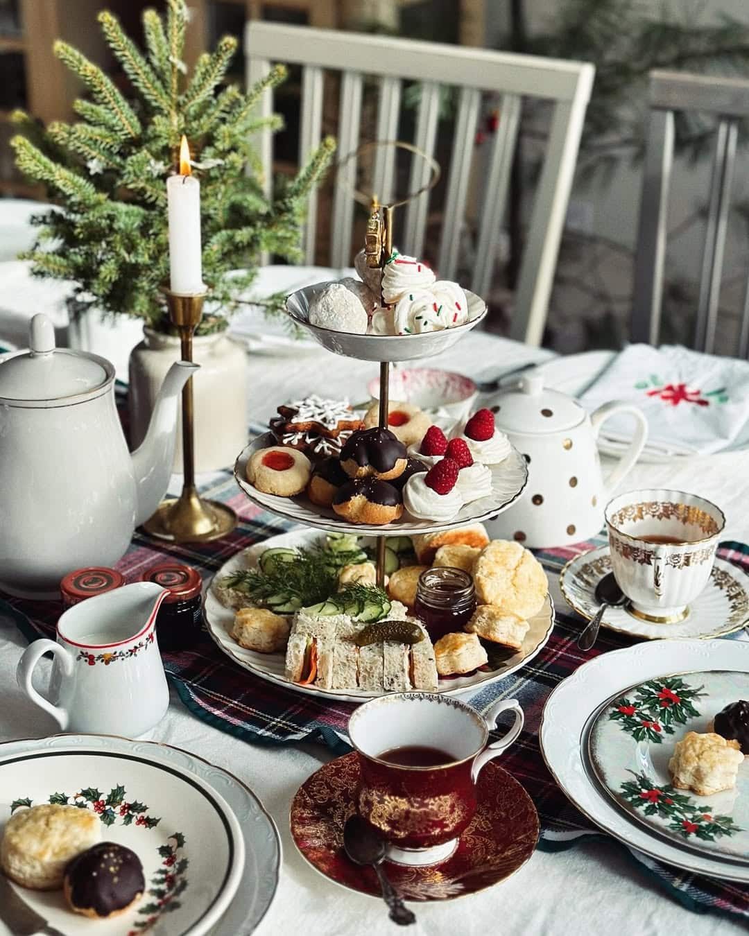 Add festive cheer to your tea table with twinkling lights, red-and-gold décor, and cinnamon-scented candles. Serve winter teas such as peppermint, spiced chai, or cranberry hibiscus. Pair with gingerbread cookies, fruitcake bites, and mini mince pies. Set Christmas carols in the background and perhaps exchange small gifts over tea. The warmth of the setting makes it perfect for cozy indoor gatherings during the holidays. A Christmas tea party brings together tradition, comfort, and joy—offering a delightful way to connect with loved ones in the festive season.