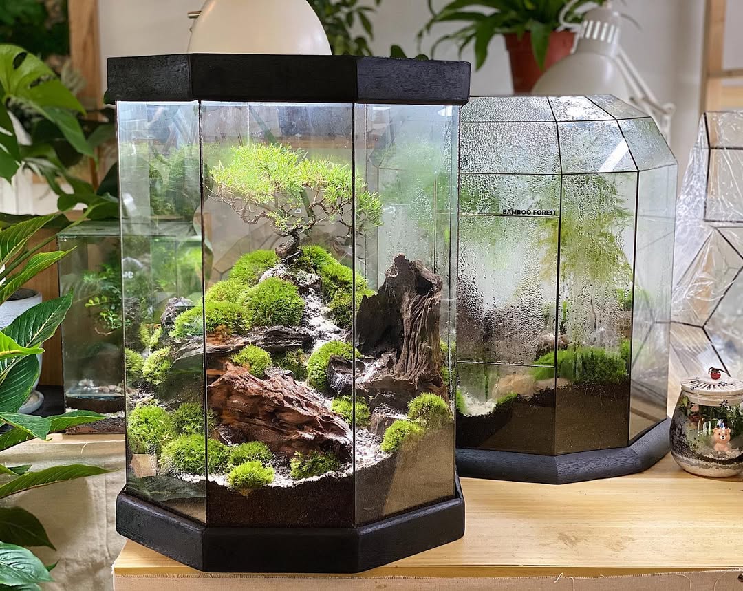 Build a peaceful moss garden inspired by Japanese Zen aesthetics. Choose lush moss varieties such as sheet moss, mood moss, or cushion moss. Arrange them on a gently sloping landscape of stones, soil, and small wooden pieces. Use a closed container to maintain moisture and mist when it begins to dry. The simplicity of moss—soft, vibrant, and low-maintenance—creates a meditative environment. This terrarium thrives in low to medium indirect light and offers a serene, minimalist green world perfect for desks, meditation corners, or quiet workspaces.