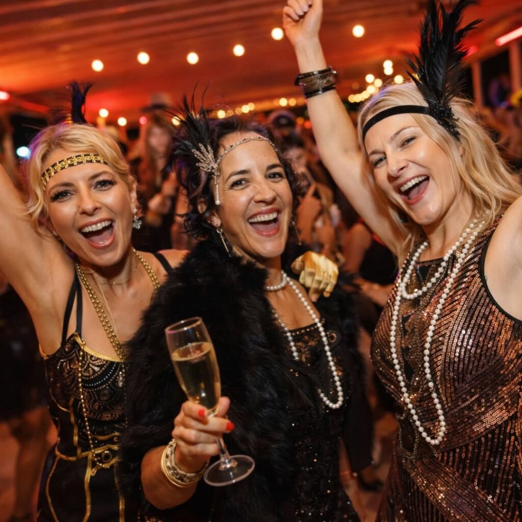 Transform your venue into a glamorous 1920s speakeasy inspired by The Great Gatsby by F. Scott Fitzgerald. Think gold and black décor, feather centerpieces, pearls, and Art Deco accents. Guests can dress in flapper dresses, fringe, tuxedos, and suspenders. Serve classic cocktails like French 75s and Old Fashioneds in vintage glassware. Add a jazz playlist or even a live saxophonist to create an authentic atmosphere. Incorporate casino-style games such as poker or roulette for entertainment. Dim lighting, candles, and dramatic table settings complete the sophisticated and indulgent 1920s vibe.