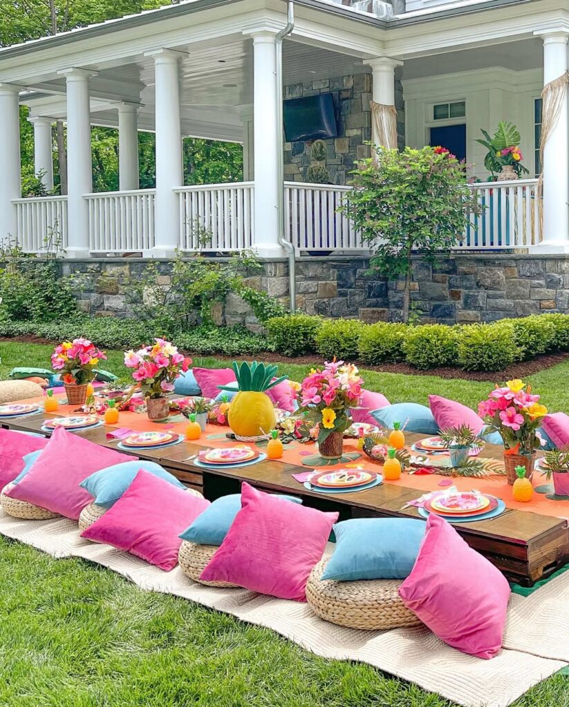 Bring island vibes inspired by Hawaii into your space. Decorate with palm leaves, tiki torches (LED for safety), bright flowers, and grass skirts. Encourage guests to wear floral shirts, leis, and sandals. Serve tropical drinks like piña coladas and mai tais in coconut cups. Offer a buffet with grilled pineapple skewers, barbecue meats, and seafood. Play reggae or Hawaiian music to set the mood. Include fun activities like a limbo contest or hula dance lesson to keep the energy light and festive.