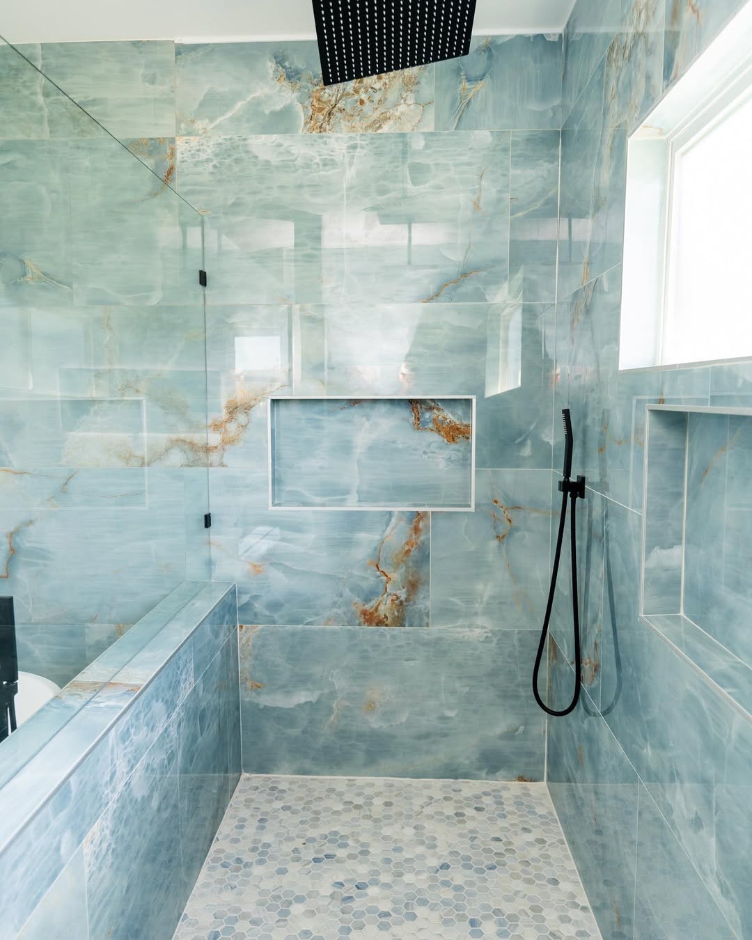 A marble tiled shower instantly elevates a bathroom with its natural veining and refined appearance. Each marble tile is unique, creating a one-of-a-kind design that feels luxurious and spa-like. Popular choices include Carrara, Calacatta, or Statuario marble in soft white and gray tones. Large-format marble tiles reduce grout lines, enhancing the seamless look. This style pairs beautifully with brass or gold fixtures and glass enclosures. Proper sealing is essential to maintain marble’s beauty, but the result is a timeless, high-end shower space.