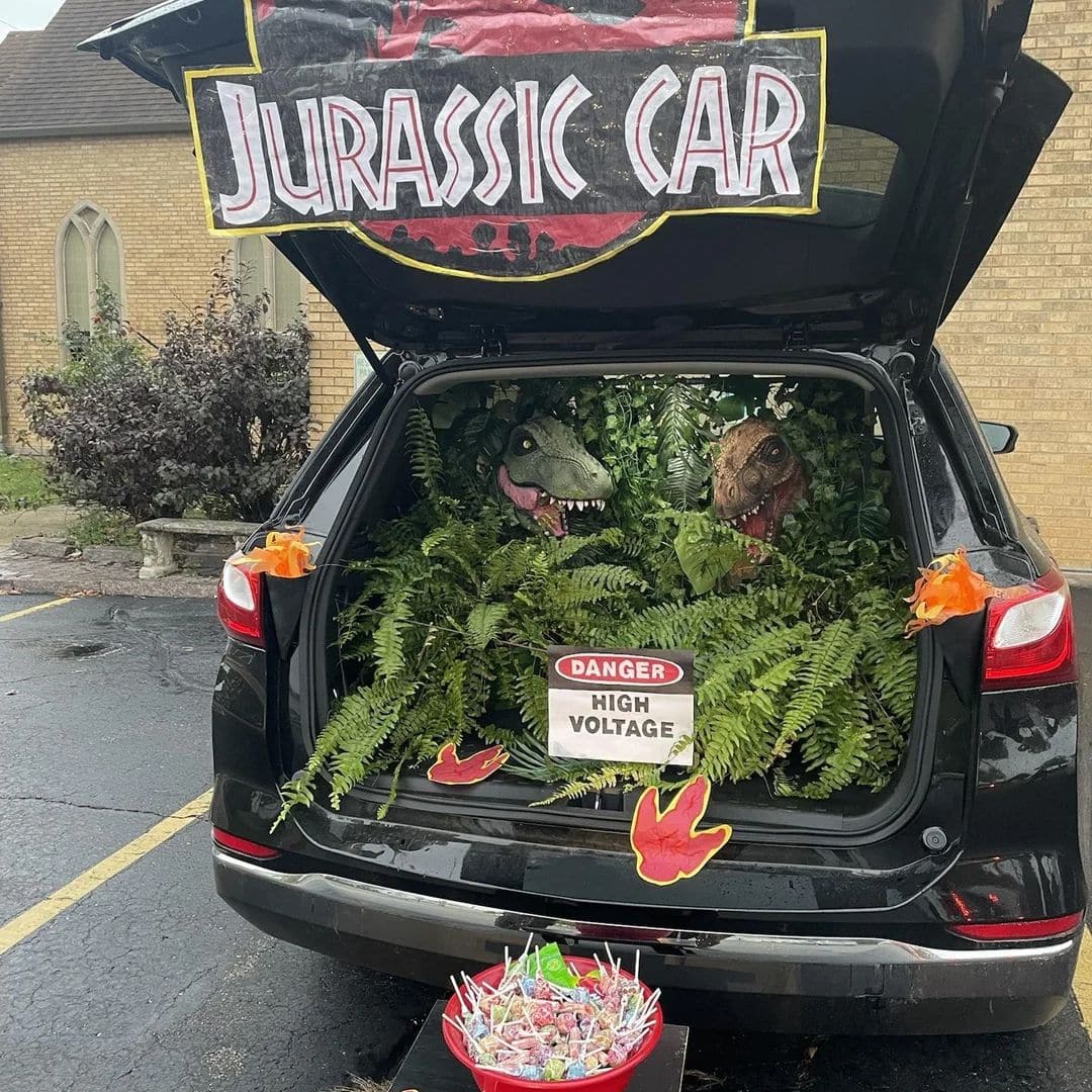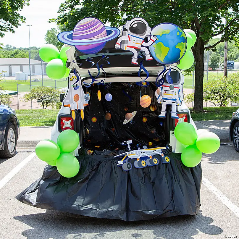 Transform your trunk into a UFO landing site with silver foil, flashing lights, and inflatable aliens. Create a “space station” complete with control panels, planets, and stars. Dress as astronauts or aliens with glowing accessories. Use a fog machine and eerie sci-fi sounds for a dramatic effect. Kids can “beam up” their candy from a glowing platform or interact with “alien specimens.” Hand out “space fuel” (candy in glow sticks or neon bags). A futuristic and fun theme that can range from silly to mysterious.