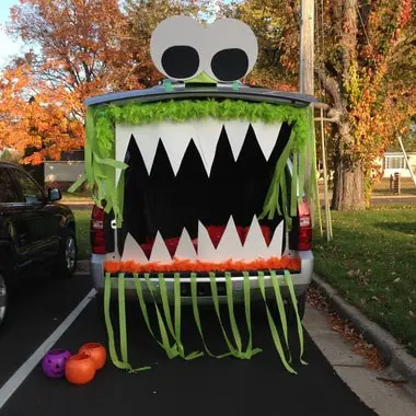 Transform your trunk into a spooky graveyard scene using faux tombstones, skeletons, fog machines, and eerie lighting. Lay out moss and dirt for realism, and add crows or bats for atmosphere. A skeleton handing out candy adds a creepy touch. Optional: play spooky background music or whispering voices for an immersive experience. Dress as a ghost or grim reaper to match the theme. Kids will love walking through the “graveyard” to collect their treats, especially if there’s a mini path or obstacle course they have to follow. It’s a classic Halloween favorite that’s always chilling and fun!