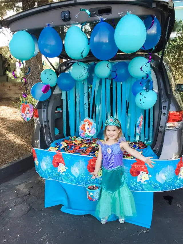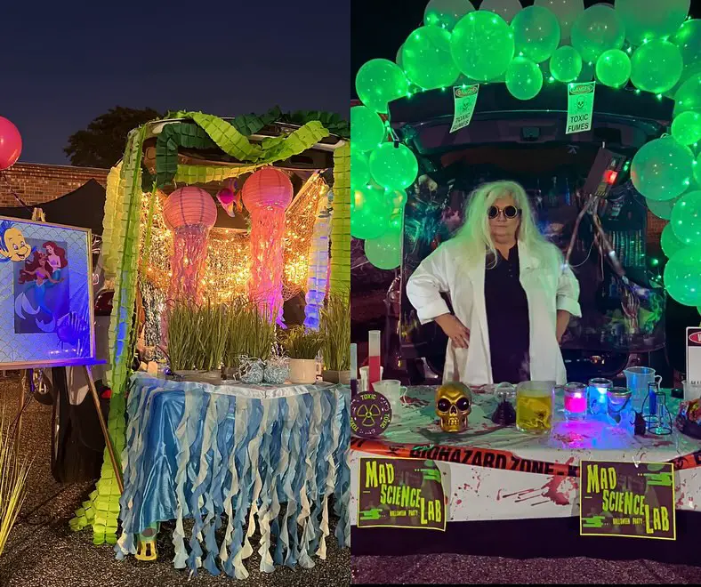 Create a magical underwater trunk scene with blue streamers, bubble balloons, and ocean backdrops. Include props like fish cutouts, mermaid tails, seaweed (green tulle or ribbons), and treasure chests filled with candy. Dress as a mermaid, pirate, or sea creature. Add LED lights for glowing water effects. Fun fact signage or sea jokes can engage kids while they wait. You can also include a fishing game or “dive for candy” activity. This whimsical setup is ideal for younger kids who might be scared by traditional spooky themes, and it provides a refreshing twist on Halloween.