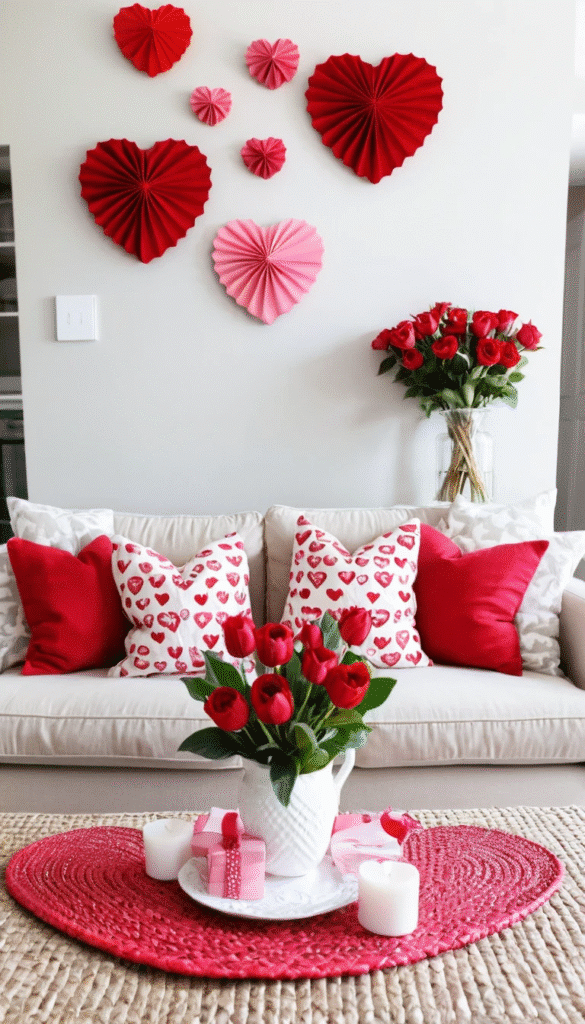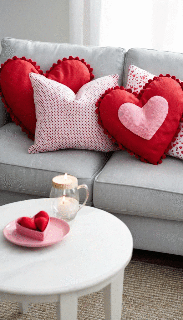 - Pillows and Throws: Add heart-patterned or red and pink cushions and blankets to your sofa.