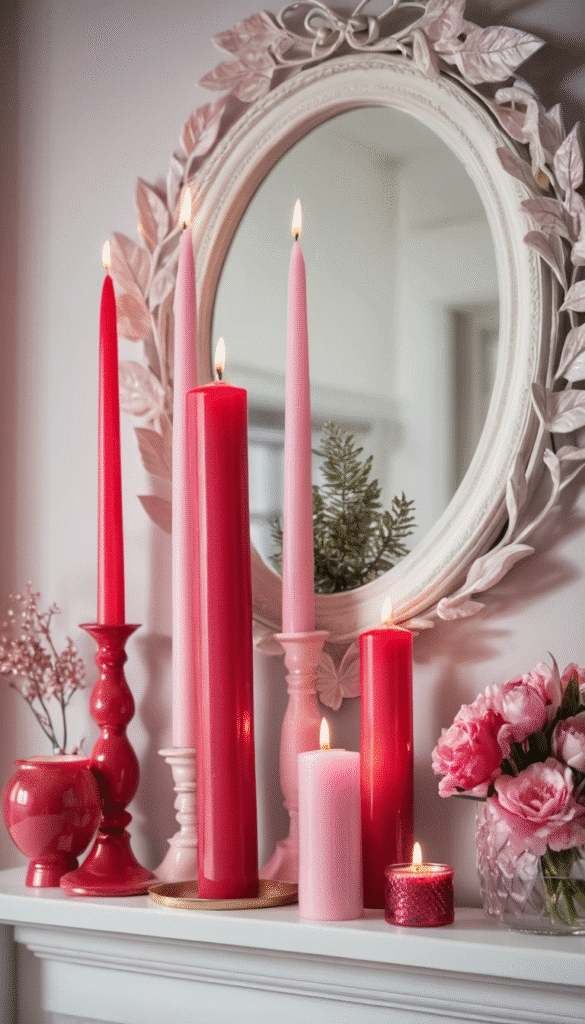 5. Red and Pink Candles on Mantelpieces