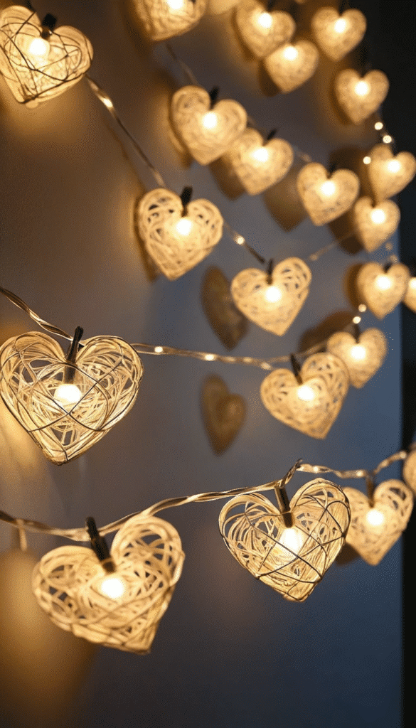 - String Lights: Hang string lights in heart shapes or in warm white tones.