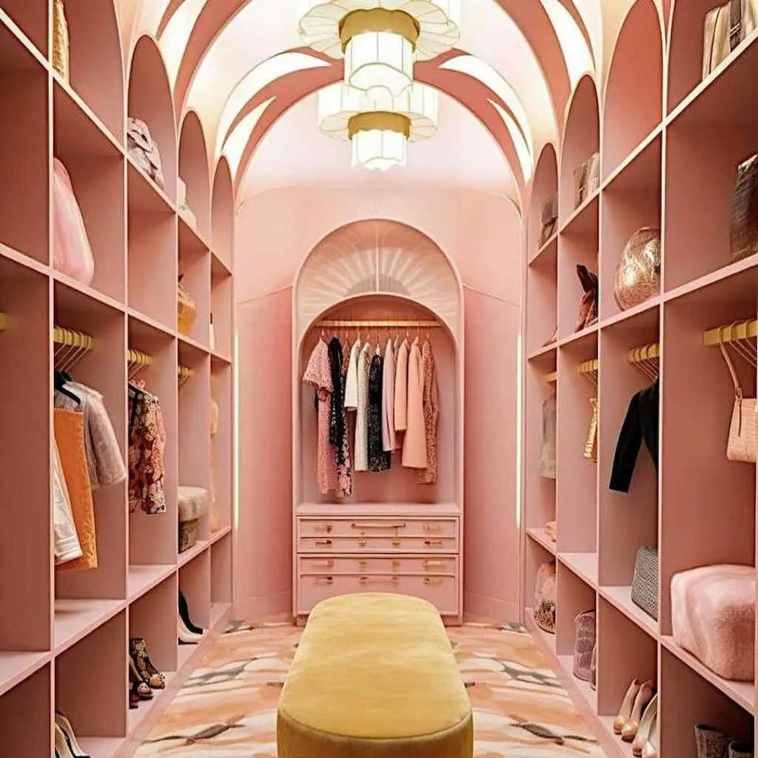 Add old Hollywood charm with vintage-inspired decor and furnishings. Use ornate mirrors, a crystal chandelier, tufted seating, and gold-accented hardware. Pair antique dressers or vanity tables with floral wallpaper or dark wood floors. Display classic handbags, shoes, or jewelry collections to enhance the retro feel. This idea is perfect for someone who wants their closet to exude personality, glamour, and timeless sophistication.