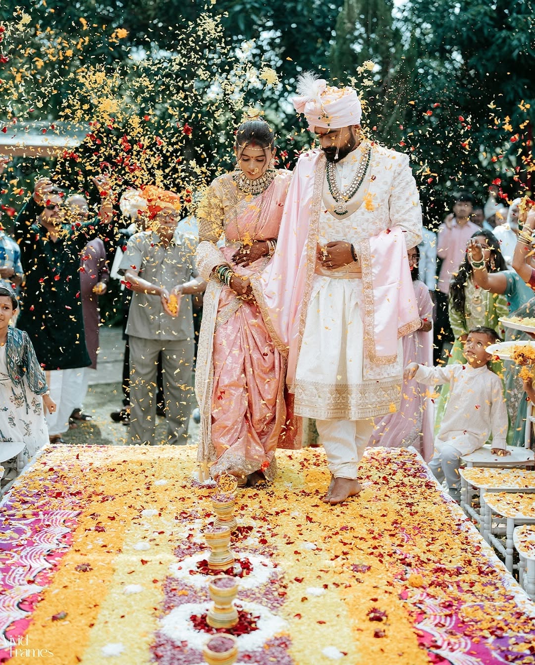 A beachfront ceremony offers breathtaking scenery and a tranquil, romantic vibe. Picture golden sands, gentle waves, and a soft ocean breeze as your backdrop. Decorations often include driftwood arches, seashell accents, white flowing fabrics, or woven textures to complement the natural environment. Guests can enjoy barefoot seating arrangements, parasols, or welcome coconuts. As the sun sets, the sky transforms into warm pastel hues, creating a natural cinematic moment for vows. This idea suits couples who love relaxed elegance, minimalistic décor, and an effortless yet stunning coastal atmosphere perfect for photography and memorable guest experiences.