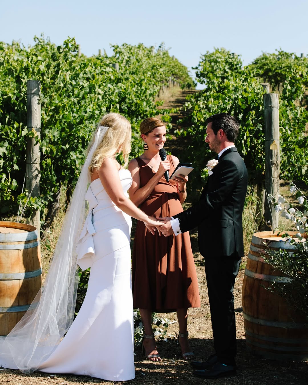 Set among rolling hills and grapevines, a vineyard ceremony is elegant, serene, and richly atmospheric. Think rustic wine barrel aisles, lush green landscapes, and a naturally romantic outdoor setting. Warm earthy tones blend with soft florals and refined tableware. Couples can integrate wine-themed touches like custom labels, wine-blending rituals, or barrel-top signing tables. The golden hour lighting enhances the scenic beauty, creating stunning photo opportunities. This idea suits couples who appreciate nature, fine wine, and a relaxed yet upscale ambiance. Vineyards offer charm, tranquility, and timeless beauty all in one setting.