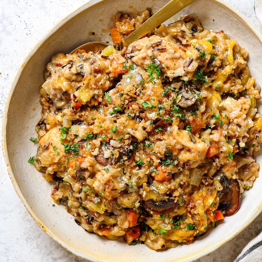 Mix cooked wild rice, chicken, soup, cheese, broccoli, garlic powder.
