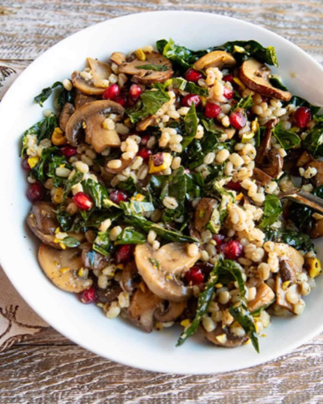 This earthy winter salad blends sautéed mushrooms—such as cremini, shiitake, or portobello—with tender cooked barley. Wilted spinach or Swiss chard brings freshness and color. Add toasted hazelnuts for crunch and shaved Parmesan for salty richness. A warm garlic-herb vinaigrette enhances the umami flavors and turns the ingredients into a cozy, satisfying bowl. This salad feels almost like a cross between a risotto and a grain bowl—perfect for cold evenings when you want comfort that’s still wholesome and light.